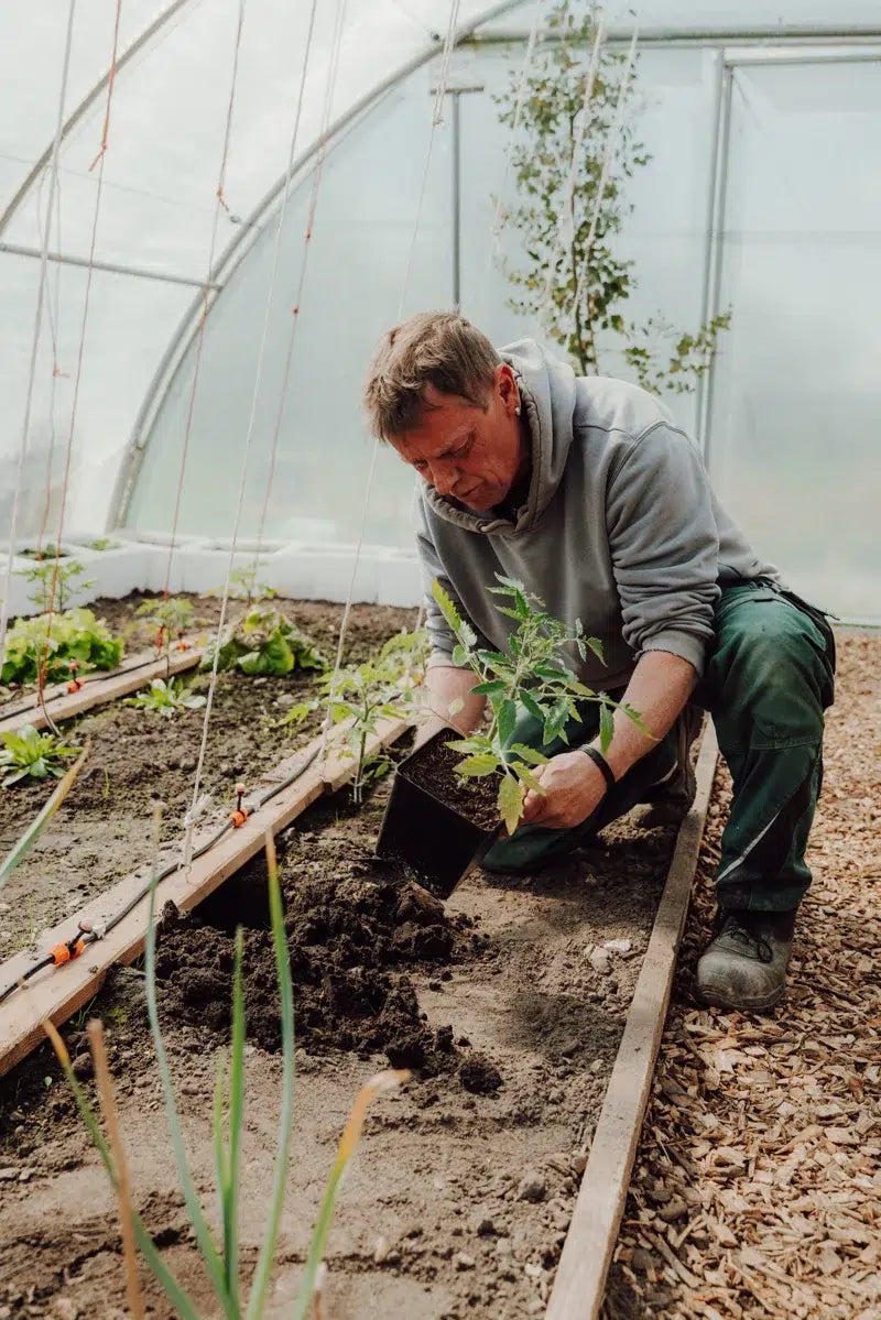 Für die Hofküche haben wir zudem eine eigene naturnahe Kläranlage errichtet. Hier werden die Fäkalien mit Stroh zu Humus verarbeitet. Die Prozesswärme wird in ein Gewächshaus geleitet.