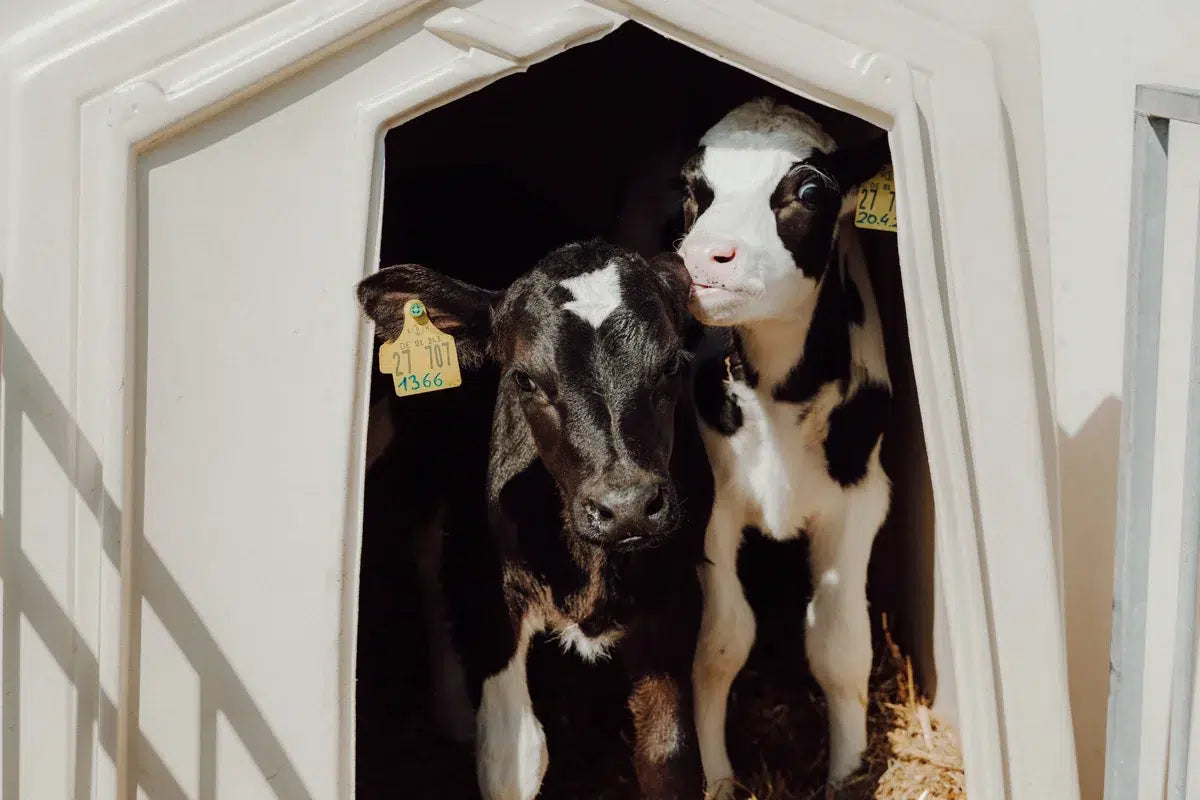 Wir arbeiten ohne muttergebundene Aufzucht. Die Kälber wachsen zunächst paarweise in Kälberiglus auf, bevor sie nach ein paar Tagen in den Kälberstall umziehen – mit großen Strohboxen und Auslauf ins Freie.